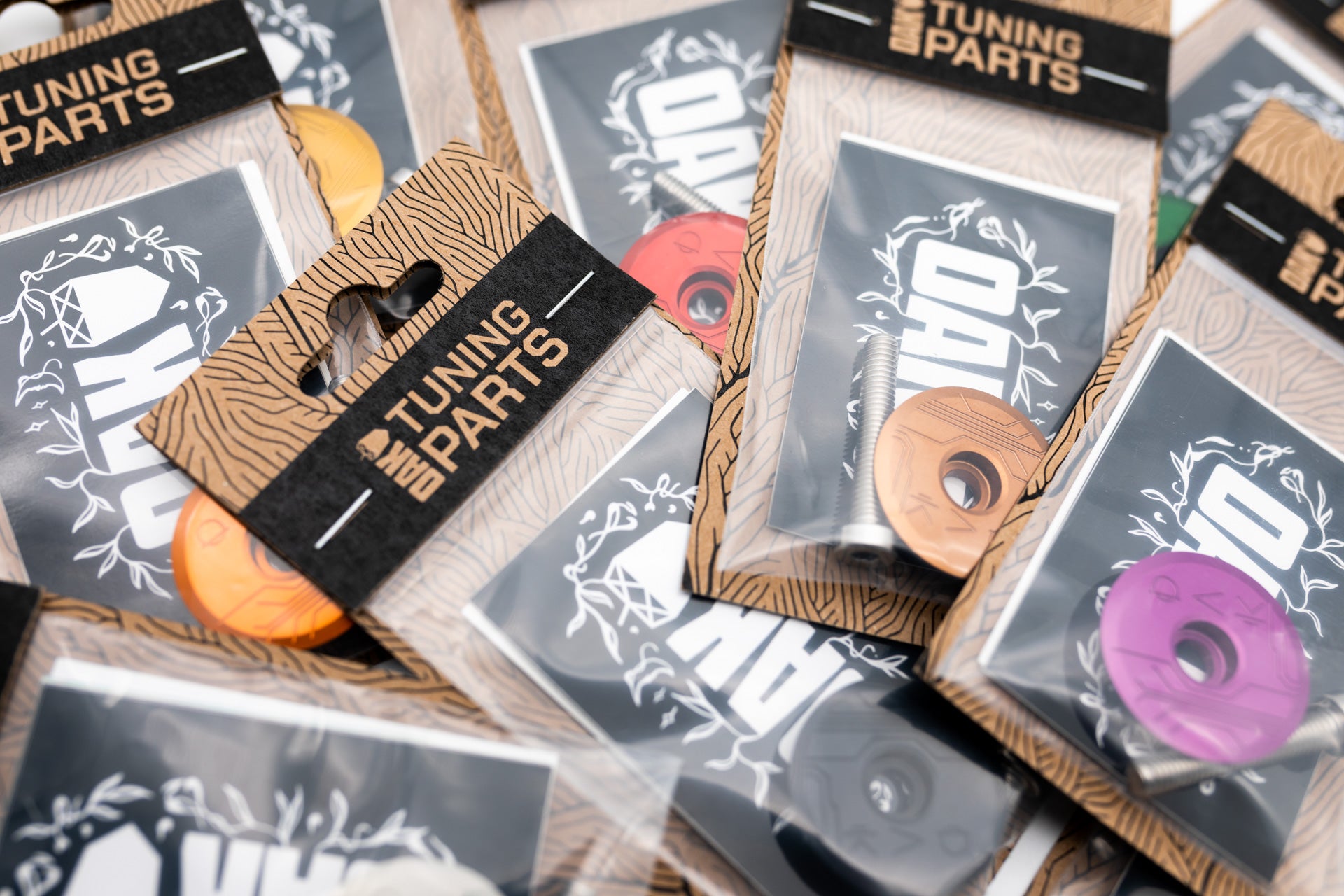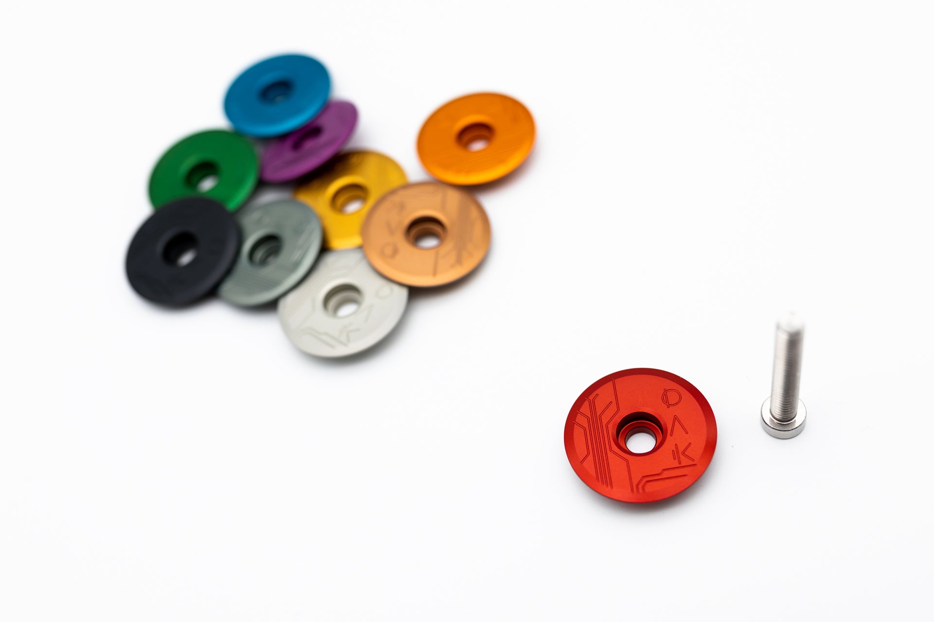 Row of eleven round Oak-branded bike parts in various colors with embossed text and circuit patterns.