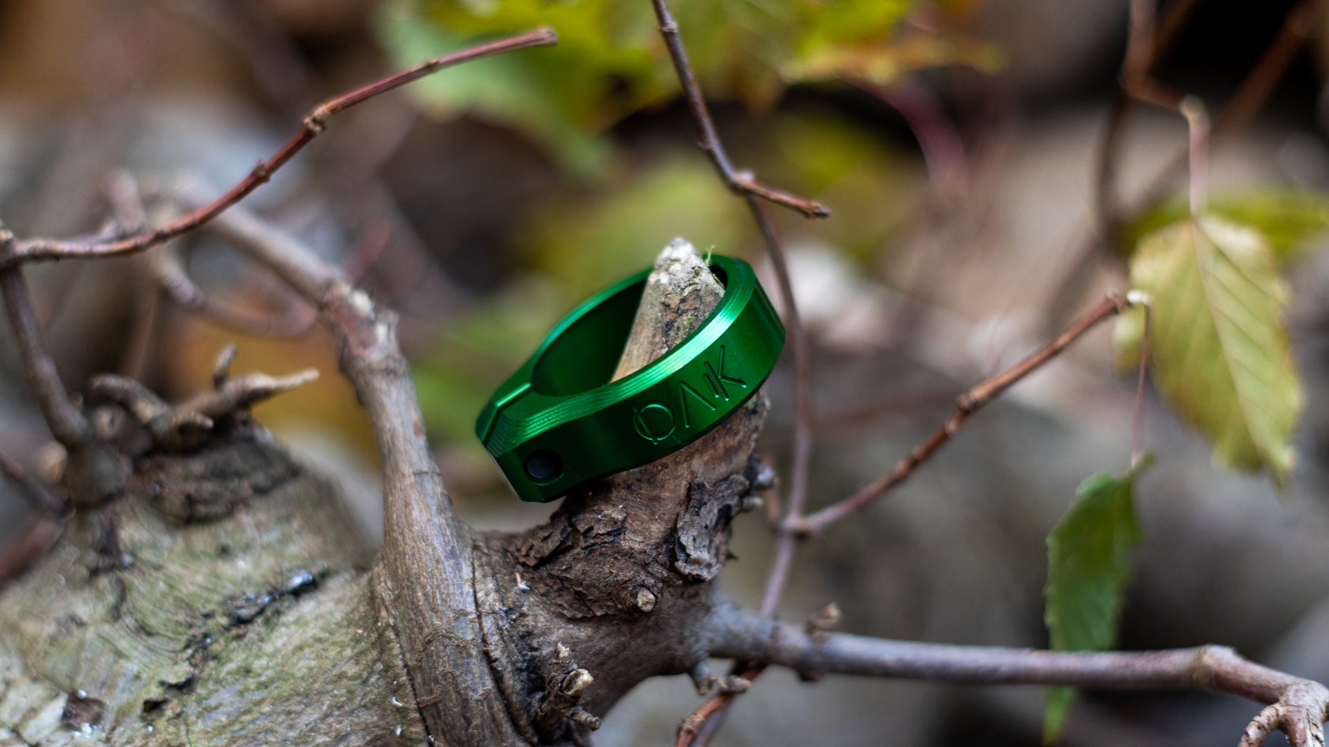 Black bicycle seat post with gold OAK engraved clamp against a blurred green background